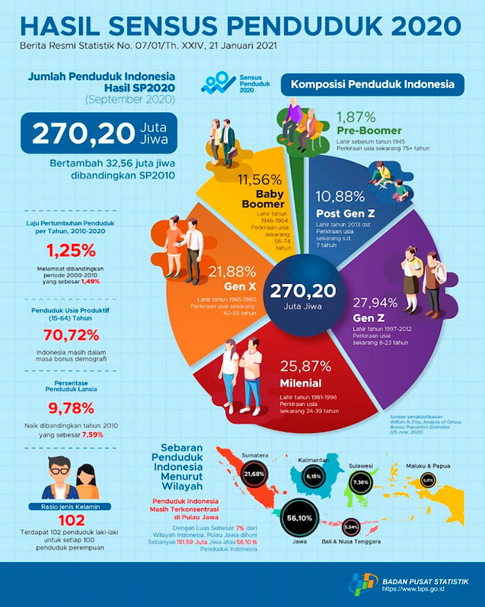 Su población al mes de septiembre de 2020 fue de 270.20 millones de personas, lo que la convierte en la cuarta nación más poblada del mundo, con la mayor población musulmana del planeta. A pesar de esto, no es un estado islamista.